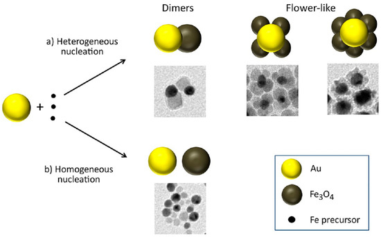 Schematic representation of the possible pathways of the seeded-growth reaction, starting from a mixture of Au nanocystals and molecules of iron precursor. (a) Heterogeneous nucleation of iron oxide, with the formation of either dimers or flower; (b) Homogeneous nucleation of iron oxide, with the consequent formation of isolated iron oxide particles. Reproduced with permission from [78]. American Chemical Society, 2017.
