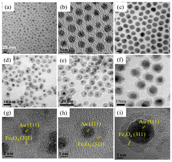 TEM images of Au NPs of (a) 2.5; (b) 4 and (c) 10 nm and the corresponding Au-Fe3O4 yolk-shell NSs starting from (d) 2.5; (e) 4 and (f) 10 nm sized Au cores. High resolution micrographs of Au-Fe3O4 yolk-shell NSs prepared starting from Au cores of (g) 2.5; (h) 4 and (i) 10 nm in size. Reproduced with permission from [79]. American Chemical Society, 2017.