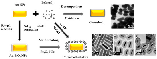 Non-spherical Au-Fe3−xO4 core-satellite NSs can be assembled through electrostatic interactions, by adsorbing Fe3−xO4 nanocrystals at the surface of Au rods [80,81,82]. Uniform and smooth Fe3−xO4 shell coating was also achieved around Au nanorods, by directly reacting Fe(acac)3 on CTAB capped Au surface in aqueous solution at room temperature [83] (Figure 15). Au nanorods were also coated by silica [84], to enhance their colloidal stability in ethanol, before growing Fe3−xO4 by thermal decomposition of Fe(acac)3 at 290 °C (Figure 15). In this case, the intermediate silica layer plays the role of a bridge between the gold and iron oxide crystals. It also preserves the plasmonic feature of Au particles and makes Fe3−xO4 uniformly distributed.