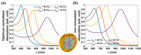 Parametric analysis of optimum normalized absorption vs. λ for two different sized Fe3O4@Au NPS with various shell-to-radius ratios ξAu (a) Dp = 60 nm, (b) Dp = 100 nm. Reproduced with permission from [87].