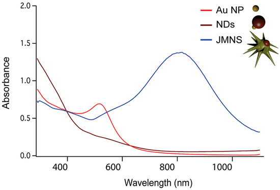 Another way to shift the plasmonic absorption toward NIR region is to change the NS shape. For example, star-shaped core-satellite structured FANSs exhibit an absorption peak much more red-shifted than spherical ones, due to the sharp tip of gold crystals. These results are well-illustrated in Figure 18 where the UV-Vis-NIR absorption spectra of three kinds of gold-based particles are plotted. The plasmonic absorption of spherical Au NPs was found to be about 520 nm, while that of their nanodumbbell (NDs) and nanodumbbell and star-shaped (called JMNSs) FANS counterparts were red-shifted to 560 nm and 800 nm, respectively.