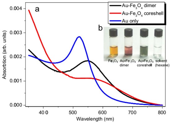 - Sheng, Y.; Xue, J. Synthesis and properties of Au-Fe3O4 heterostructured nanoparticles. J. Colloid Interface Sci. 2012, 374, 96–101. [Google Scholar] [CrossRef] [PubMed]