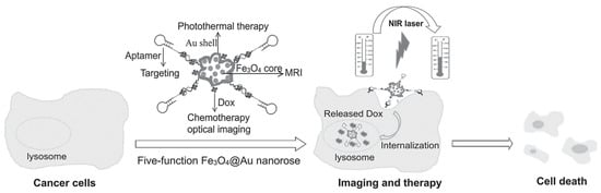 - Li, C.; Chen, T.; Ocsoy, I.; Zhu, G.; Yasun, E.; You, M.; Wu, C.; Zheng, J.; Song, E.; Huang, C.Z.; et al. Gold-coated Fe3O4 nanoroses with five unique functions for cancer cell targeting, imaging and therapy. Adv. Funct. Mater. 2014, 24, 1772–1780. [Google Scholar] [CrossRef] [PubMed]