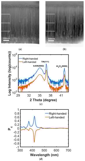 Figure 1a,b show side-view SEM images of right- and left-handed InAlN nanospirals, respectively, grown on sapphire substrates assisted with a 120-nm TiN seed layer under identical conditions except for the rotational sense. These chiral nanospirals consisted of four complete turns with a designed pitch of 250 nm, as shown in the images. However, the first pitch is slightly shorter and yields thinner spirals than those in the subsequent pitches, which is attributed to incubation from the self-induced formation of nuclei followed by a coalescence and coarsening process until steady-state growth is achieved in the axial direction [25,26,27]. The crystalline structure of these nanospirals characterized by θ/2θ scan XRD are shown in Figure 1c. Reflections of InAlN(0002), TiN(111), and Al2O3(0006) are exclusively present in this scan, located at 35.1, 36.9, and 42.7°, respectively. The SEM and XRD results indicate that these InAlN chiral nanospirals grow preferentially along the c-axis and have the same In content of 0.19, as calculated by Vegard’s law without taking strain effect into consideration [23]. The circular polarization measurements of the samples are performed by MMSE. The opposite chirality of the Pc curves measured from two samples with different handedness can be clearly seen in Figure 1d. The mirroring shape of the two curves is proof of high reproducibility in the MSE growth process. Though the values of Pc are slightly different between the samples; the high Pc of around 0.75 at 417 nm indicates that the CLEG InAlN chiral nanospirals are very promising for use as high performance chiral optical elements. It should be noted that the high Pc values are an indication that these advanced structures of nanospirals, with complex internal crystal structures instead of homogenous layers [20], cannot be fully modeled using an ideal stratified 90° twisted structure, since that would suggest suppression of the chiral Bragg peaks. While the full modeling of the structures is beyond the scope of the present work, it is the topic of an extensive study, including a larger set of rotation schemes, which is under way.