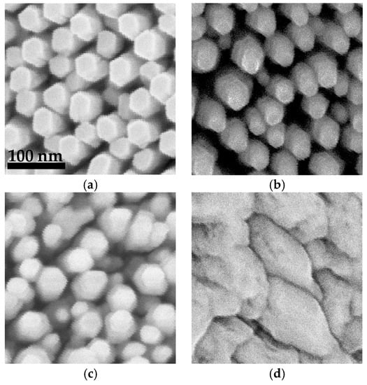 At growth temperatures of 650 and 750 °C, well-separated hexagonal nanospirals are formed, having a well-defined diameter with little deviation as can be seen in Figure 2a,b. When reducing the temperature to 550 °C, the top of the nanospirals becomes tapered with the diameter varying widely from 10 to 50 nm, as shown in Figure 2c. At temperatures lower than 450 °C, the InAlN initially grows with nanospiral geometry (not shown here), but then coalesces, hence forming a thin-solid film-like nanostructure with size bigger than 200 nm, as shown in Figure 2d. In addition, the thickness of the film-like nanostructure is thinner than that of the well-separated nanospirals. Since the volume of the deposited material is the same, a higher growth rate is expected for the well-separated nanostructures. However, a trend of decreasing nanospiral total thickness from 1.19 to 0.85 µm with increasing temperature from 550 to 750 °C is observed, which is attributed to a lower In incorporation rate at a higher growth temperature [26,27].