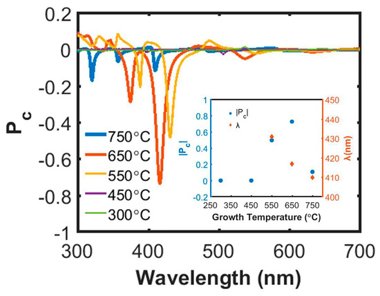 The InAlN growth temperature affects not only the morphology, but also the nanospiral material’s optical properties. Figure 3 shows a plot of Pc versus wavelength for five different temperatures. Distinct Pc peaks can be seen when the growth temperature is in the range of 550–750 °C. The highest |Pc| of approximately ~0.75 is obtained for the sample grown at 650 °C. |Pc| decreases to 0.5 for the 550 °C sample, and more dramatically to 0.1 at 750 °C. Almost no Pc peak can be identified for the samples grown at temperatures lower than 450 °C. As seen in the SEM images, the sample grown at 450 °C loses the separated nanospiral geometry owing to coalescence, which removes the conditions for constructive Bragg reflection [17,18]. However, the spiral form is retained for the 750 °C sample but its In-content, as determined by Vegard’s law, is found to be around 0.09. This is substantially less than 0.17 ± 0.02 for samples grown at 650 °C or lower, owing to less efficient In incorporation during high temperature growth [26,27,28]. Since lower In incorporation results in a less lateral compositional gradient in the nanospirals, the birefringence contributed from the internal compositional gradient becomes less effective on Pc [20,21,22]. This consequence of low Pc may indicate that the high |Pc| obtained from the 650 °C sample is attributed to both external nanospiral geometry and internal compositional gradient [20]. In addition, the wavelength λ for the |Pc| peak value versus growth temperature is plotted in the inset of Figure 3. The variation of λ shows a trend of shifting towards a shorter wavelength with increasing growth temperature, which can be attributed to a decreased pitch of the nanospirals (due to reduced In incorporation), and is in agreement with the circular Bragg reflection condition λ = , where p is the pitch of nanospirals and is the effective refractive index [17,18].
