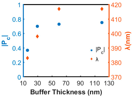 In this section, we studied the effect of the TiN seed layer thickness on |Pc| and the corresponding peak wavelength. The thickness of the seed layer was varied from 16 to 120 nm, while the InAlN nanospiral growth was kept constant using a growth temperature of 650 °C. As can be seen in Figure 4, a large increase of |Pc| from 0.37 to 0.69 is obtained with increasing TiN thickness from 16 to 30 nm. A further increase of thickness to 120 nm gives slightly increased |Pc| to 0.75. Also, the peak wavelength λ changes and shifts to longer wavelengths with increasing buffer thickness but remains constant when the buffer is thicker than 60 nm. Since a high |Pc| results from a strong constructive Bragg reflection, we can speculate that a thicker and thus more reflecting TiN buffer layer minimizes the depolarization and incoherency occurring in a thinner and semi-transparent buffer layer. TiN is reported to be almost opaque for thicknesses larger than 160 nm [29], but already at a thickness of 60 nm most of the light should be reflected from the TiN buffer layer. Together with the observation that the peak wavelength shifts to higher values, we conclude that a larger pitch of well-defined InAlN nanospirals is promoted by the thicker buffer layers.