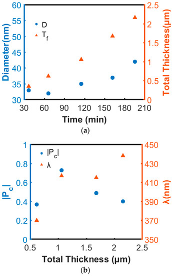 This set of nanospirals was deposited on top of 60 nm-thick TiN buffer, with little difference in Pc compared to the 120 nm-thick buffer. For the total thickness series, we conducted 1-, 2-, 4-, 6- and 8-turn nanospiral growth experiments, with a designed pitch of 250 nm. All films were formed using a growth temperature of 650 °C. We observed that both the diameter and total thickness of the nanospirals increase with growth time, but the diameter change is less pronounced when the total thickness is smaller than 1 µm, as can be seen in Figure 5a. From side-view SEM images (not shown here), the surface of 6- and 8-turn nanospirals grew rougher and more uneven compared to 4-turn nanospirals, and a branch-like structure was formed for 8-turn nanospirals. The spiral geometry becomes rod-like with some branches owing to the formation of new nucleation sites on the surface. Figure 5b reveals trends in |Pc| and λ as a function of total thickness. A dramatic increase of |Pc| from 0 to 0.75 is obtained by adding more turns to the nanospirals, as expected since constructive interference enhances with the number of periods in the structure. However, |Pc| can be reduced if the periodic structure deteriorates, as suggested by the results obtained from 6- and 8-turn nanopirals. In addition, λ seems to have a small red-shift trend towards longer wavelengths with growth time. Detailed examination of the present nanospiral growth rate indicated an increase over time, with a resulting increase of pitch. Since the sputtering power was fixed for all depositions, we observed an increase of Al cathode voltage correlated with a decrease of current with time. A higher cathode voltage may offer a higher sputtering yield, resulting in a higher growth rate [30].