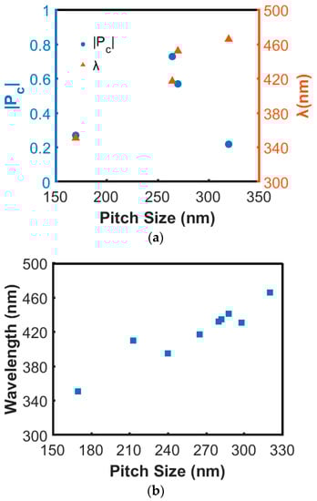 Hence, we further studied the effect of pitch on |Pc| and λ. A series of samples were grown at 650 °C with different pitches, while total thickness was kept constant at around 1 µm. As can be seen in Figure 6a, λ shifts to longer wavelength with increasing pitch. The |Pc| values are lower for shorter and longer pitch. For shorter pitch, λ is expected to fall into the UV region where the InAlN material has a stronger absorption and thus reduces the reflected light. If the pitch is too long, the film contains fewer periods, leading weaker constructive interference. The peak wavelength position is expected to vary linearly with the pitch according to the Bragg condition. A plot of λ versus pitch analyzed from a larger set of samples, regardless of variation in growth parameters, is shown in Figure 6b. The peak wavelengths in the range of 350–470 nm have high consistency with their corresponding pitch size ranges from 170–320 nm. This monotonic increase of wavelength with pitch is evidence that the circular polarization is connected to the constructive Bragg reflection, as expected. Hence, precise control of the pitch of the grown nanospirals is important for the design of chiral-optical response elements.