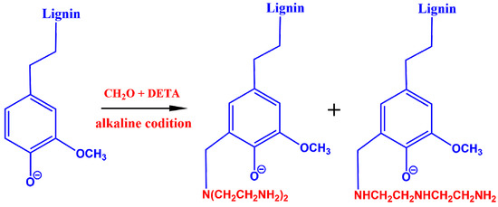 The alkaline lignin (20 g) was dissolved in NaOH solution (100 mL) at pH 12 and 50 °C. The dissolved lignin was further reacted with DETA (12 g) at 90 °C. Successively, 18 mL of HCHO solution (37 wt %) were added to the mixture dropwise. This mixture was kept reacting for 4 h before the lignin amine was precipitated by HCl (37 wt %) solution [27,28,29]. The brown precipitate was collected by suction filtration, followed by washing with 1 M HCl solution and freeze-dried under vacuum. Consequently, the DETA side chains were grafted to the lignin at the ortho position of phenolic hydroxyl groups, obtaining the lignin amine, shown in Figure 1.