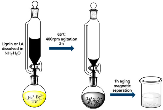 The above lignin and the synthesized lignin amine were further used as coating agent on the magnetic nanoparticles. Herein, inspired from the co-precipitation method [26,30,31], we developed a one-step reaction to synthesize the lignin grafted magnetic nanoparticles (LMNPs) and the lignin amine grafted magnetic nanoparticles (LAMNPs), as shown in Figure 2. The detailed procedures are given as follows: FeCl3·6H2O (0.54 g) and FeCl2·4H2O (0.2 g) were added together into 100 mL water in a three-neck flask with protection of nitrogen atmosphere. The solution was stirred at 400 rpm and 65 °C for 10 min. Then, 10 mL NH3·H2O solution (5 wt %) with dissolved lignin or lignin amine were added dropwise by a pressure-equalizing dropping funnel. To keep the pH above 10 during the whole process, 30 mL of NH3·H2O solution (5 wt %) were added to the flask dropwise. The sample was kept reacting at 65 °C for 120 min. The obtained black solution was cooled down under room temperature and aged for 60 min. Finally, the LAMNPs were separated by magnet and washed by deionized water three times.