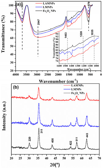 (a) FT-IR spectrum of LAMNPs (red), LMNPs (blue) and MNPs (black); and (b) XRD patterns of LAMNPs (red), LMNPs (blue) and MNPs (black). The insert in (a) is the enlargement of the gray rectangular region.