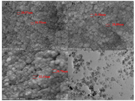 SEM images of: (a) LMNPs, 25%; (b) LMNPs, 50%; and (c) LMNPs, 100%; and TEM image of: (d) LMNPs, 50%.