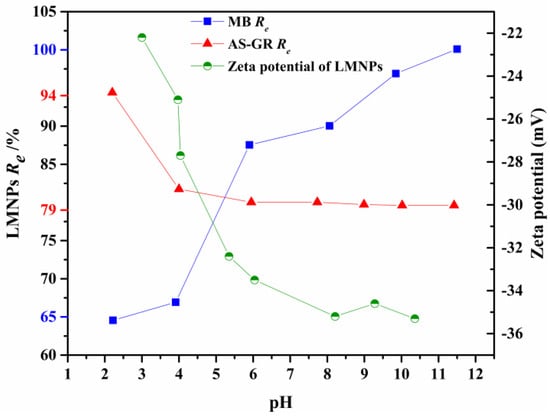 Removal efficiency of cationic and anionic dyes using LMNPs and zeta potential of LMNPs as a function of solution pH (the maximum and minimum removal efficiencies of MB and AS-GR are indicated as blue and red labels, respectively).