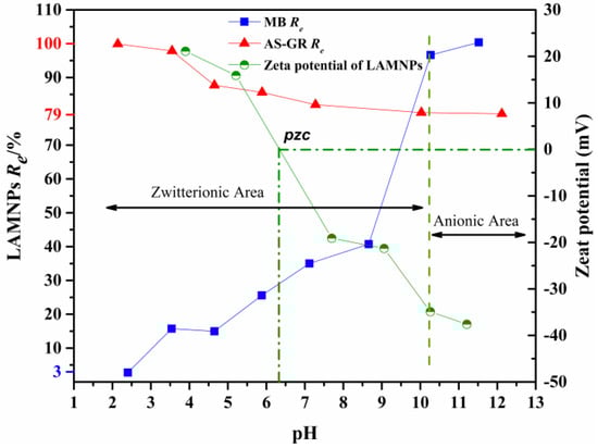 Removal efficiency of cationic and anionic dyes using LAMNPs and zeta potential of LAMNPs as a function of solution pH (the maximum and minimum removal efficiencies of MB and AS-GR are indicated as blue and red labels, respectively).
