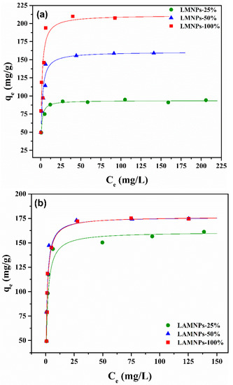 Three isothermal models were used to describe the adsorption isotherms of dyes on the MNPs surface. The linear forms of equations of the tested isotherm models are presented as Equations (5)–(7). The Langmuir isotherm (Equation (5)) assumes a monolayer surface coverage of the dyes on the solid surface structure. The Freundlich isothermal model (Equation (6)) is an empirical model which is applicable for multilayer adsorption. The Tempkin isotherm assumes the decrease of heat of adsorption is linear, when the adsorbate–adsorbent interactions are considered.