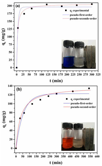 The experimental data and fitting lines of different kinetic models are shown in Figure 9. The corresponding kinetic model parameters as well as the correlation coefficients are given in Table 5. Clearly, for both MNPs and dyes, pseudo-second-order provides the best correlation of experimental data with r2 over 0.99. This result suggests that the chemical adsorption instead of dye diffusion is the rate-controlling step for the adsorption process [40,41].