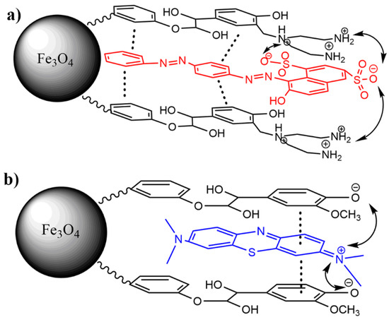 According to the above discussion, the adsorption of different dyes onto the dual responsive modified MNPs could be understood as follows: The main interaction force between AS-GR and adsorbents shell is π–π interaction, due to the relatively large nonpolar part of the AS-GR molecule. The protonated cationic amine sites in LAMNPs under acidic condition improve the adsorption efficiency by the electrostatic attraction between the ionized amine groups and AS-GR molecule (Figure 10a). However, with relatively large aromatic structure, AS-GR molecules need more time to diffuse into the adsorption sites and rearrange their orientation to the stable state However, the main interaction force between MB and lignin shell is electrostatic attraction. The positively charged MB molecules are much easier to be adsorbed by the LMNPs with ionized phenolic groups grafted on the surfaces (Figure 10b). When the adsorbent surface possesses cationic sites (LAMNPs), MB cannot be adsorbed by π–π interaction, due to the electrostatic repulsion and lack of nonpolar aromatic part. Comparing to AS-GR, the MB adsorption process is much quicker due to the relatively small molecule volume and global polar structure of MB.