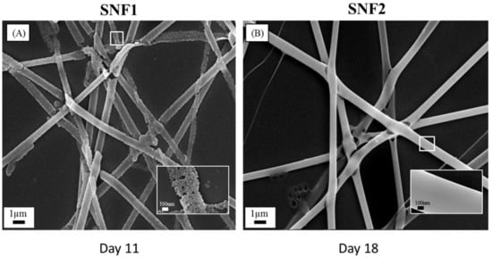 Scanning electron microscope (SEM) images of (A) SNF1 immersed in 10 mM PBS with daily buffer exchange at 37 °C after 11 days and (B) SNF2 immersed in 10 mM phosphate-buffered saline (PBS) with daily buffer exchange at 37 °C after 18 days. The insets are the magnification of the corresponding surfaces. The scale bars represent 1 μm in (A,B) and 100 nm for the insets.