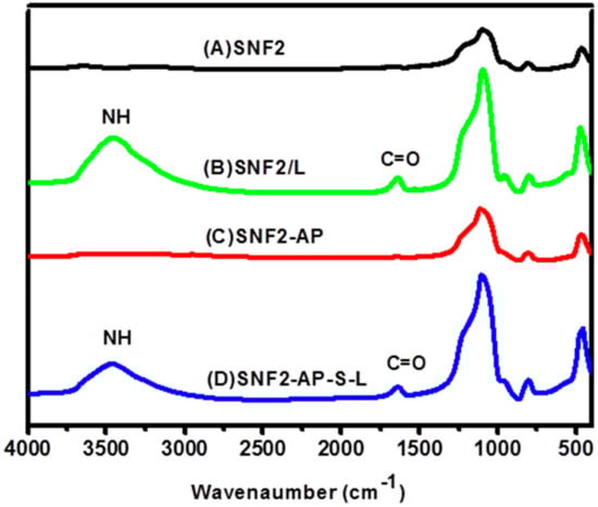 Fourier transform–infrared (FTIR) spectra of (A) SNF2, (B) SNF2/L, (C) SNF2-AP and (D) SNF2-AP-S-L.