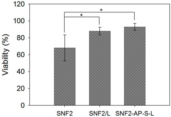Cell viability comparison between PC12 cells cultured on the as-prepared SNF2, SNF2/L, and SNF2-AP-S-L substrates. Assessments were done using LIVE/DEAD® stain with Ethidium Homodimer-1 and Calcein AM 72 h after seeding. n = 12 t-test, * p < 0.05, compared to SNF2.