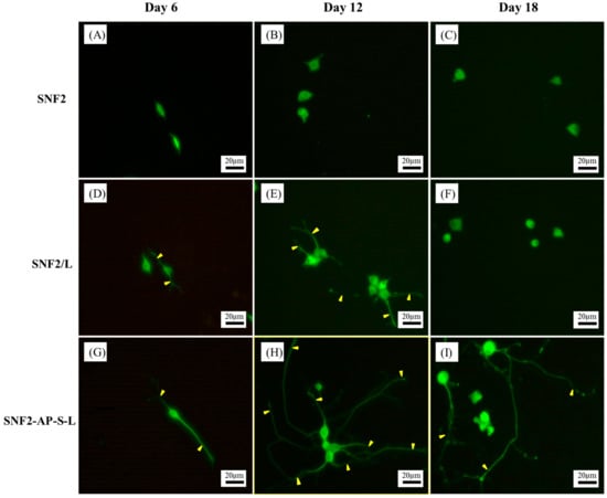 Fluorescence microscopy image of PC12 cells differentiation on SNF2 (A–C), SNF2/L (D–F) and SNF2-AP-S-L (G–I) for different periods of time. Neurites (indicated with arrowheads) were immunostained with MAP2 (green). (A,D,G) at Day 6. (B,E,H) at Day 12. (C,F,I) at Day 18. Scale bars represent 20 μm.