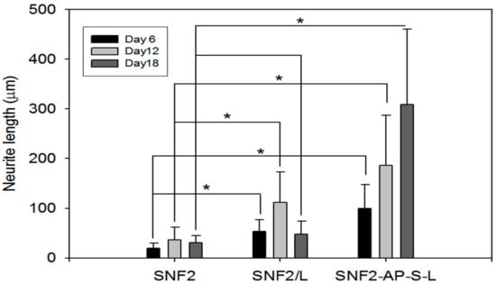 Bar graph comparing the neurite length of PC12 cells cultured on the as-prepared SNF2, SNF2/L and SNF2-AP-S-L substrates at the different time points of Day 6, Day 12 and Day 18 (n = 30, t-test, * p < 0.05).