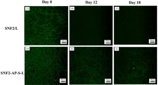 Fluorescence images of SNF2/L (A–C) and SNF2-AP-S-L (D–F) substrates immunostained with anti-laminin antibody at different time point: (A,D) Day 0, (B,E) at Day 12, (C,F) at Day 18. Scale bars represent 20 μm.