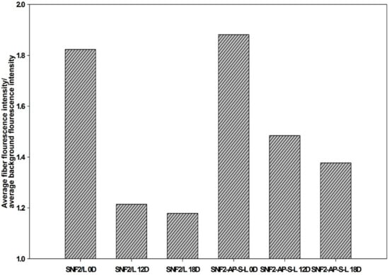 To quantify this data, we used the image analysis software, Image J [46] to obtain the average signal intensity from 10 randomly-selected regions of 50 pixels on both the electrospun fiber and the background. The ratio of the average intensities gathered from the fiber over background is reported on the y-axis of Figure 10. This data indicate that physically-adsorbed laminin eroded faster as time went on with daily media exchange. SNF2-AP-S-L, which has covalently-crosslinked laminin, retained much more of its fluorescent signal than SNF2/L after 18 days of daily media exchange. This result supports our hypothesis that SNF2-AP-S-L can sustain longer-term neurite outgrowth due to the slower erosion of covalently-crosslinked laminin.