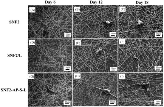 Having verified that our SNF2 substrate exhibits a greater degree of cross-linkage and increased fiber diameter, we quantified its degradation rate relative to SNF1. Both SNF1 and SNF2 were immersed in PBS with daily buffer exchange; SEM imaging reveals that SNF2 was able to maintain its structural integrity beyond 18th days (Figure 2). Using higher magnification, we observed that the fiber surface of SNF2 at day 18 maintained better structural integrity than that of SNF1 at day 11 (Figure 2). Thus, SNF2 exhibits significantly delayed degradation compared to SNF1, which had barely any structure left by the 15th day [24].