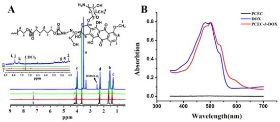 Characterization of DOX-h-PCEC. (A) 1HNMR spectra of PCEC in CDCl3 (I), NPC-activated PCEC in CDCl3 (II), Hydrazide-functionalized PCEC in CDCl3 (III) and DOX-h-PCEC in DMSO-d6 (IV); (B) UV spectra of PCEC (0.3 mg/mL), DOX (50 μg/mL), and DOX-h-PCEC (0.3 mg/mL) in DMSO.