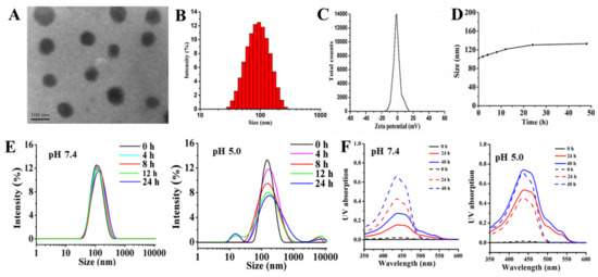 The encapsulation stability of CUR in CUR/DOX-h-PCEC@CRGDK NPs and CUR loaded PCEC NPs was comparatively studied by an ultrafiltration centrifugal tube. The CUR encapsulated NPs were diluted in PBS pH 7.4 and 5.0 containing 10% methanol as solubilizer, and then stored for 0 h, 24 h, and 48 h. After being filtered using a Millipore Amicon Ultra-0.5 centrifugal filter (MWCO ≈ 10 kDa, Millipore Corp., Bedford, MA, USA), the UV absorption curves of the filtrate that were collected at a different time were measured by UV-vis spectrophotometer. The changes in size of CUR/DOX-h-PCEC@CRGDK NPs due to acid-triggered hydrolysis of hydrazone bonds were followed by DLS. The NPs solutions in PBS pH 7.4 and 5.0 were prepared, and then the changes in NPs size at 37 °C were monitored in time by DLS.