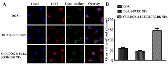 Efficient and selective cellular uptake of therapeutic drugs plays a key role in improving chemotherapy efficacy and decreasing side effects. Neuropilin-1 is overexpressed in many human cancer cells, providing a useful targeting site for tumor-specific drug delivery [41,42,43,44,45]. In this study, the cellular uptake of free DOX, DOX-h-PCEC NPs, and CUR/DOX-h-PCEC@CRGDK NPs was monitored by confocal laser scanning microscope in Neuropilin-1 overexpressed HUVEC cells. DAPI was used to label nucleus (blue) and Lyso-Tracker was applied to label lysosomes (green). As shown in Figure 5A, the red signals, due to the intrinsic fluorescence of DOX, were clearly observed in the cytoplasm and nuclei of the treated HUVEC cells, indicating the rapid passive diffusion of free DOX and effective endocytosis of DOX-loaded NPs. Further inspection of Figure 5A shows that, for the cells after 4 h of incubation with free DOX, the relative weak fluorescence was observed in the cytoplasm of cells, indicating that the DOX molecules successfully entered the cells, but mainly accumulated in the cytoplasm. By contrast, when the cells were incubated with DOX-loaded NPs, the fluorescence mainly appeared in the proximity of cellular nuclei. When compared with fluorescence intensity in the cells that were treated with DOX-h-PCEC NPs, the detected fluorescence in the cells treated with CUR/DOX-h-PCEC@CRGDK NPs was much higher in the nuclei. Apparently, significantly enhanced cellular uptake and considerably increased nucleus localization were confirmed in HUVEC cells that were incubated with CUR/DOX-h-PCEC@CRGDK NPs. Moreover, as a measurement of fluorescence intensity of DOX, the gray value for images, as a gross approximation, was determined using the image analysis software (Figure 5B). The results of measuring fluorescence intensity based on average gray value also demonstrated that both the cell uptake and nucleus localization of CUR/DOX-h-PCEC@CRGDK NPs were much higher than that of free DOX and DOX-h-PCEC NPs without CRGDK. These results definitely revealed that CRGDK surface decorated CUR/DOX-h-PCEC@CRGDK NPs possess significantly improved binding activity with Neuropilin-1 overexpressing cancer cells, and thus can exploit the efficient receptor-mediated endocytosis to achieve cell-specific drug delivery.