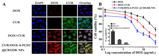 MTT assay was performed to compare the cytotoxicity of free DOX, physical mixture of DOX and CUR, and CUR/DOX-h-PCEC@CRGDK NPs against MCF-7/ADR cells. MCF-7/ADR cells were seeded into the 96-well plates at 8000 cells per well, cultured in 100 μL complete dulbecco’s modified eagle medium (DMEM) with the addition of DOX (1 μg/mL), and incubated at 37 °C with 5% CO2. The supernatants were discarded, and the cells were washed twice with PBS (pH 7.4) after 24 h. Free DOX, physical mixture of DOX and CUR, and CUR/DOX-h-PCEC@CRGDK NPs were put in the wells for 24 h at a DOX concentration of 0.125, 1.25, 2.5, 5, 10, 20, 40 μg/mL, respectively. The culture medium without DOX (PBS) was put in the wells for control groups. Then, 20 μL MTT dye (5 mg/mL) was added. Then, the cells were incubated for 4 h at 37 °C and the medium was replaced by 150 μL DMSO to dissolve the resulting formazan crystals. The absorption was recorded at 570 nm using a microplate reader (Thermo Scientific Varioskan Flash, Waltham, MA, USA). The experiments were conducted in triplicate and the results were presented as the average ± standard deviation.