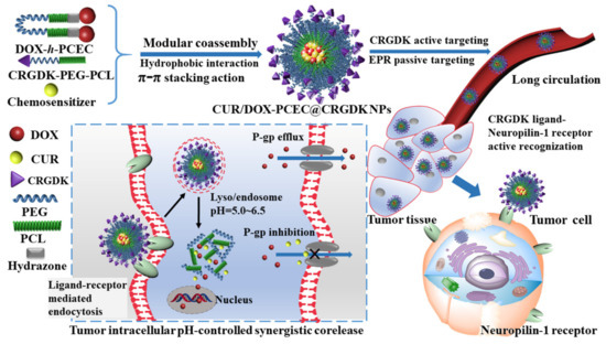Schematic illustrations of the modular coassembly to construct an all-in-one multifunctional multidrug delivery system (curcumin (CUR)/ acid-cleavable PEGylated polymeric prodrug (DOX-h-PCEC) @Cys−Arg−Gly−Asp−Lys (CRGDK) nanoparticles (NPs)) with the capability of efficient encapsulation, targeted delivery, and intracellular controlled corelease.