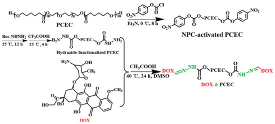 The hydrazone-linked DOX polymeric prodrug DOX-hydrazone-poly(ε-caprolactone)-b-poly(ethyleneglycol)-b-poly(ε-caprolactone)-hydrazone-DOX (DOX-h-PCEC) was prepared in three steps, according to a modified procedure [46], including (I) ring-opening polymerization of CL with HO-PEG-OH to prepare PCEC based on our group’s previous work [47]; (II) introduction of the hydrazide group to both ends of PCEC; and, (III) conjugation of DOX to both ends of PCEC. After preparing PCEC (PCL17-PEG34-PCL17, Mn ≈ 5.3 kDa), the hydrazide-functionalized PCEC was prepared, as follows. Firstly, PCEC (1.05 g, 0.2 mmol) and TEA (83.4 μL, 0.6 mmol) were dissolved in flask with appropriate THF (10 mL). After incubation in the ice-water bath, NPC (96.7 mg, 0.48 mmol) dissolved in THF (5 mL) was dropwise added into the flask and the reaction lasted for 8 h. The resultant salts were removed by filtration and then the NPC-activated PCEC was precipitated from cold ether and dried in vacuum. Subsequently, the NPC-activated PCEC (about 1.13 g, 0.2 mmol) was dissolved in DMF and reacted with Boc-NHNH2 (66.1 mg, 0.5 mmol) for 12 h. The resultant mixture was treated by TFA (2.5 mL) for 4 h at room temperature to remove -COOC(CH3)3 to obtain hydrazide-functionalized PCEC. After removing DMF by dialysis in water using a dialysis membrane with a molecular weight cutoff (MWCO) of 3.5 kDa, the hydrazide-functionalized PCEC was obtained by lyophilization. Finally, hydrazide-functionalized PCEC (1.08 g, 0.2 mmol) and excess DOX (0.272 g, 0.5 mmol) were dissolved in DMSO (20 mL) and reacted for 24 h at 30 °C in the presence of acetic acid as catalyst (0.5 mL). Unreacted DOX were removed using dialysis for 24 h against DMSO. Then, DMSO was removed by dialyzing for 24 h against PBS buffer (pH 7.4). After lyophilization, DOX-h-PCEC was obtained at a yield of 89%. All of the reactions were performed in a dark room.