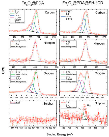 3.1. Characterization of Fe3O4@PDA and Fe3O4@PDA@SH-βCD