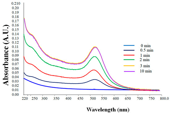 The formation of AuNPs was evident from the change in solution color from light-yellow to ruby-red as well as from the presence of the typical plasmon peak in the range of 525–540 nm with a peak maximum in the range of approximately 527–535 nm in the UV-vis spectrum. The peak is a distinctive characteristic of spherical AuNPs with a diameter of 30–50 nm [61,62]. Monitoring the reaction kinetics using UV-vis spectroscopy confirmed the completion of the reaction after 3 min as evident from the stability of the plasmonic peak, with no significant change beyond this time, as shown in Figure 1. The concentration of the generated AuNPs was determined spectrophotometrically using the Beer-Lambert law with an extinction coefficient ɛ of 1.8 × 1010 M−1∙cm−1 for a particle diameter of 50 nm [62].