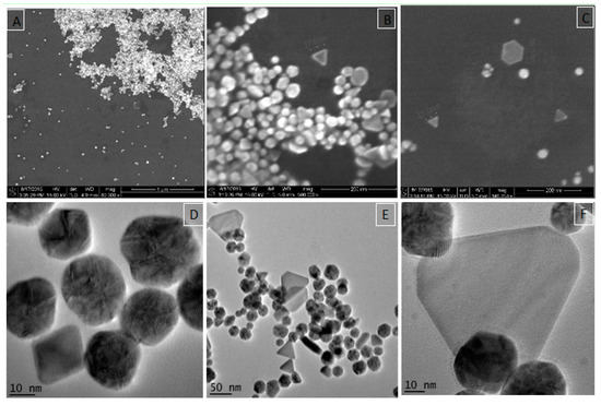 Figure 2. Unstained electron microscope images of AuNPs; SEM images (AC) and bright-field TEM images (DF). The shape of most NPs is spherical while triangular and hexagonal platelets, as well as truncated AuNPs, are also observed. The sample contains different lattice formations from single layer “Au” to multilayers (D,F). Scale bars in Figure 2A is 1 um, Figure 2B,C is 200 nm.