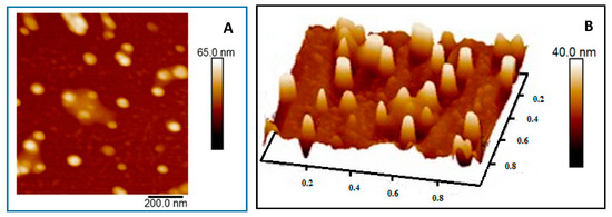 AFM analysis evaluated the presence and size distribution of the generated AuNPs. The scanning area was 1 × 1 µm in a tapping mode and both two-dimensional (2D) and three-dimensional (3D) images were generated (Figure 4). The images confirm the uniform distribution of AuNPs as most of the particles were approximately 40–50 nm in diameter with a sphere topology, consistent with the DLS and TEM measurements.