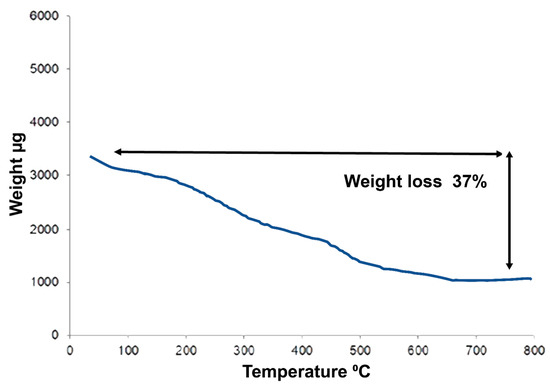 TGA was performed using a PerkinElmer Diamond TG/DTA STA 6000 (PerkinElmer, Buckinghamshire, UK) operating between room temperature and 900 °C at a heating rate of 10 °C·min−1 with an O2 flow of 20 mL·min−1. The freeze-dried sample (−54 °C under vacuum and pressure) was loaded to a clean pan supported by a precision balance. The mass of the dried sample was monitored and recorded at the beginning and during the experiment. The sample temperature was raised to 100 °C and held at that temperature for 15 min to ensure moisture removal from the sample before allowing the set temperature to increase gradually according to the set rate.