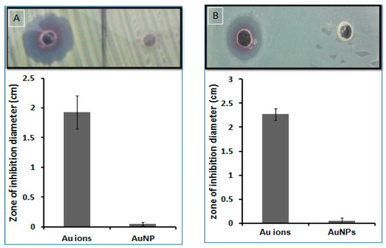 Figure 8. Antimicrobial activity of AuNPs and gold ions using a zone of inhibition assay. (A) Antifungal activity on C. albicans and (B) antibacterial activity on E. coli. Error bars represent the standard deviation of three independent experiments. Upper panel photographic image shows the inhibition zone of the Au3+ ions left and AnNPs right.