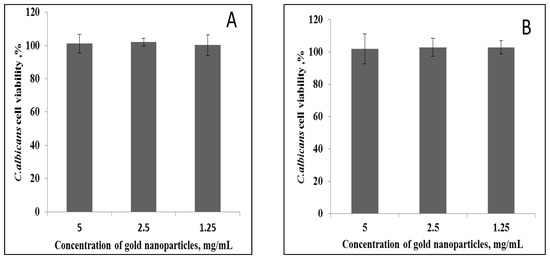 Fungicidal activity was determined by microdilution plate assay using C. albicans (SC5314) as described previously [46]. Briefly, cell suspensions (20 µL of 1.8 × 105 cells/mL, suspended in 20 mM sodium phosphate buffer at pH 7.4) were mixed with 20 µL of (5, 2.5, 1.25 mg/mL) AuNPs in water, and incubated for 2 h at 37 °C with shaking at a speed of 550 RPM. The reaction was diluted by the addition of 360 µL phosphate buffer (5 mM/pH 7), after which 40 µL of cell suspension was spread on Sabouraud dextrose agar and incubated for 24 h at 37 °C. Loss of viability was calculated as [1 − (colony-forming unit CFUs in the presence of AuNPs/CFUs with no particles)] × 100.
