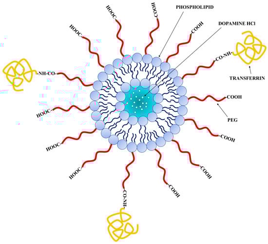 In this context, to overcome these disadvantages, a promising strategic delivery system to enhance BBB penetration by DA is the use of nanocarriers such as liposomes (LPs) decorated with uptake-facilitating ligands (Figure 1). In particular, the active targeting approach could be reached using LPs decorated with transferrin (β-1 glycopeptide) (Tf), a hydrophilic carrier that regulates the extracellular iron level in human fluid by binding and sequestering it. In fact, Tf receptor, a dimeric transmembrane glycoprotein, certainly represents a successful target molecule since it as well as being overexpressed in different malignant cells that require high levels of iron for their growth is also localized on the endothelia surface of brain capillaries that comprise the BBB [19,20,21]. Numerous researchers used the targeting to Tf receptor for improving the BBB transport of drugs [22,23].