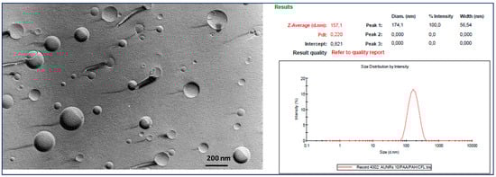Freeze fracture electron micrograph and size distribution of unfunctionalized DA∙HCl-LPs.