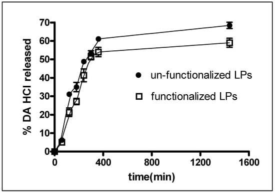 In vitro release studies were carried out by dialysis and the obtained cumulative release profiles are reported in Figure 3. The percentage of DA∙HCl released was found to be 59.0 ± 4.2% and 68.4 ± 2.9% for Tf functionalized and unfunctionalized LPs, respectively, after a period of 24 h, without any burst effect. The lower value found for functionalized LPs can be explained by the presence of Tf bound on the LPs surface which results in a decrease in the liposomal membrane permeability, slowing down drug release. This behavior is perfectly in line with what has been reported in the literature [20,22].