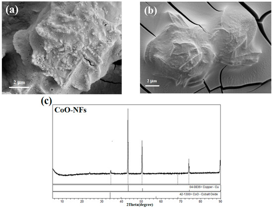 To estimate the loading mass of CoO on copper foam, the result of the ICP-OES test is displayed in Table 2. The samples of CoO-NFs and CoO-FLs were prepared using the same process. Therefore, the mass loading of CoO is estimated according to Equation (1) and the average of the results is used for the electrochemical measurements.