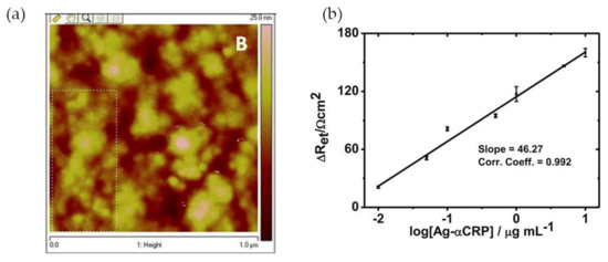 - Yagati, A.K.; Pyun, J.C.; Min, J.; Cho, S. Label-free and direct detection of C-reactive protein using reduced graphene oxide-nanoparticle hybrid impedimetric sensor. Bioelectrochemistry 2016, 107, 37–44. [Google Scholar] [CrossRef] [PubMed]