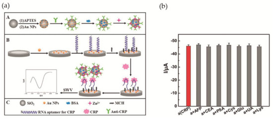 - Wang, J.; Guo, J.; Zhang, J.; Zhang, W.; Zhang, Y. RNA aptamer-based electrochemical aptasensor for C-reactive protein detection using functionalized silica microspheres as immunoprobes. Biosens. Bioelectron. 2017, 95, 100–105. [Google Scholar] [CrossRef] [PubMed]