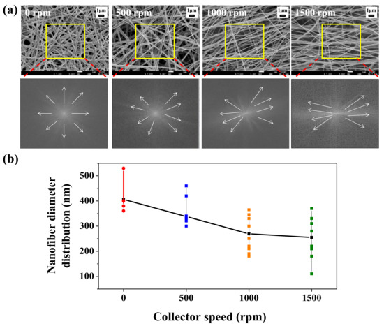 (a) Scanning electron microscope (SEM) images, Fast Fourier-transform (FFT) images and (b) nanofiber diameter distribution of BNT-ST nanofibers according to the rotation speed of the collector.